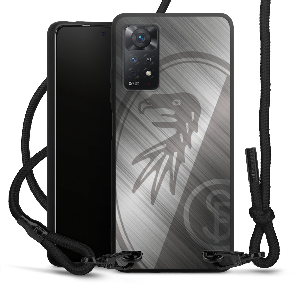 Pure Black: Handyhülle, Stoffband und Metalldetails in stylischem Mattschwarz.