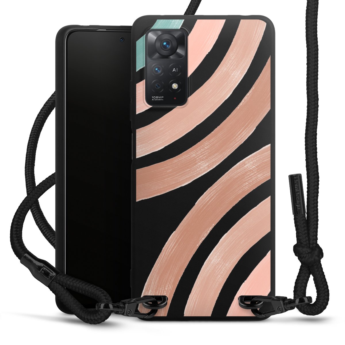 Pure Black: Handyhülle, Stoffband und Metalldetails in stylischem Mattschwarz.