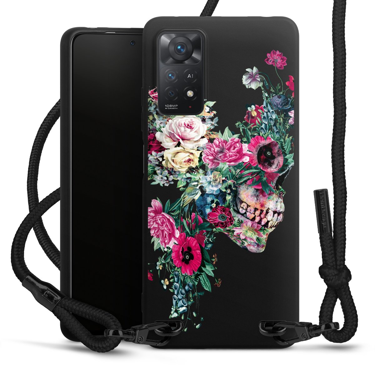 Pure Black: Handyhülle, Stoffband und Metalldetails in stylischem Mattschwarz.