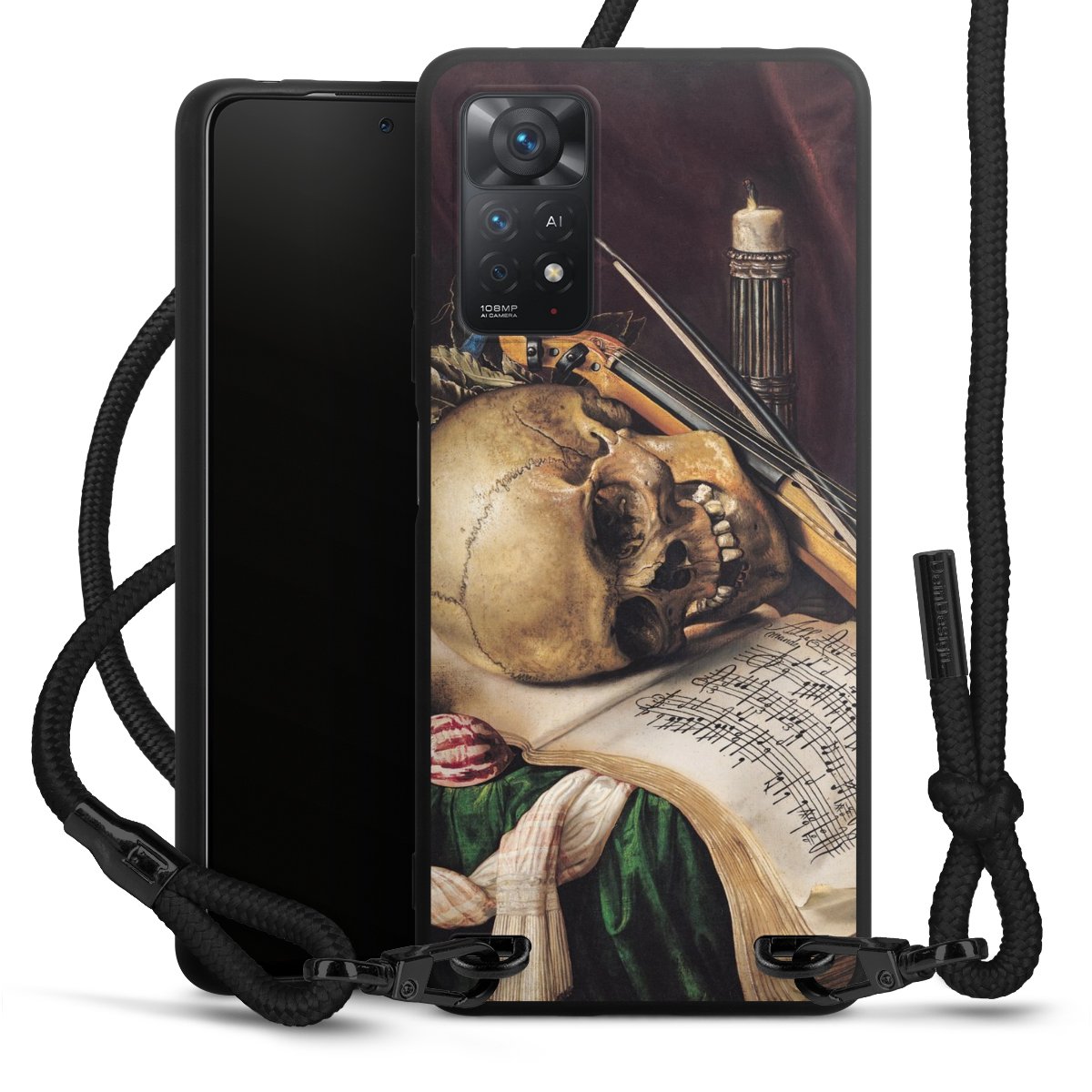 Pure Black: Handyhülle, Stoffband und Metalldetails in stylischem Mattschwarz.