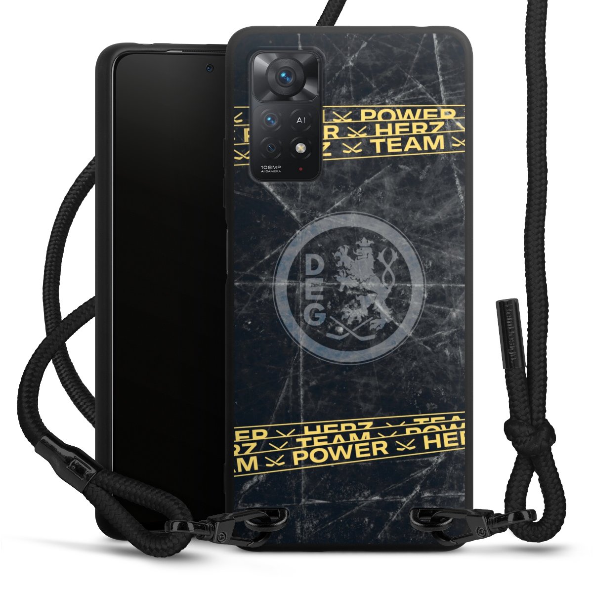 Pure Black: Handyhülle, Stoffband und Metalldetails in stylischem Mattschwarz.