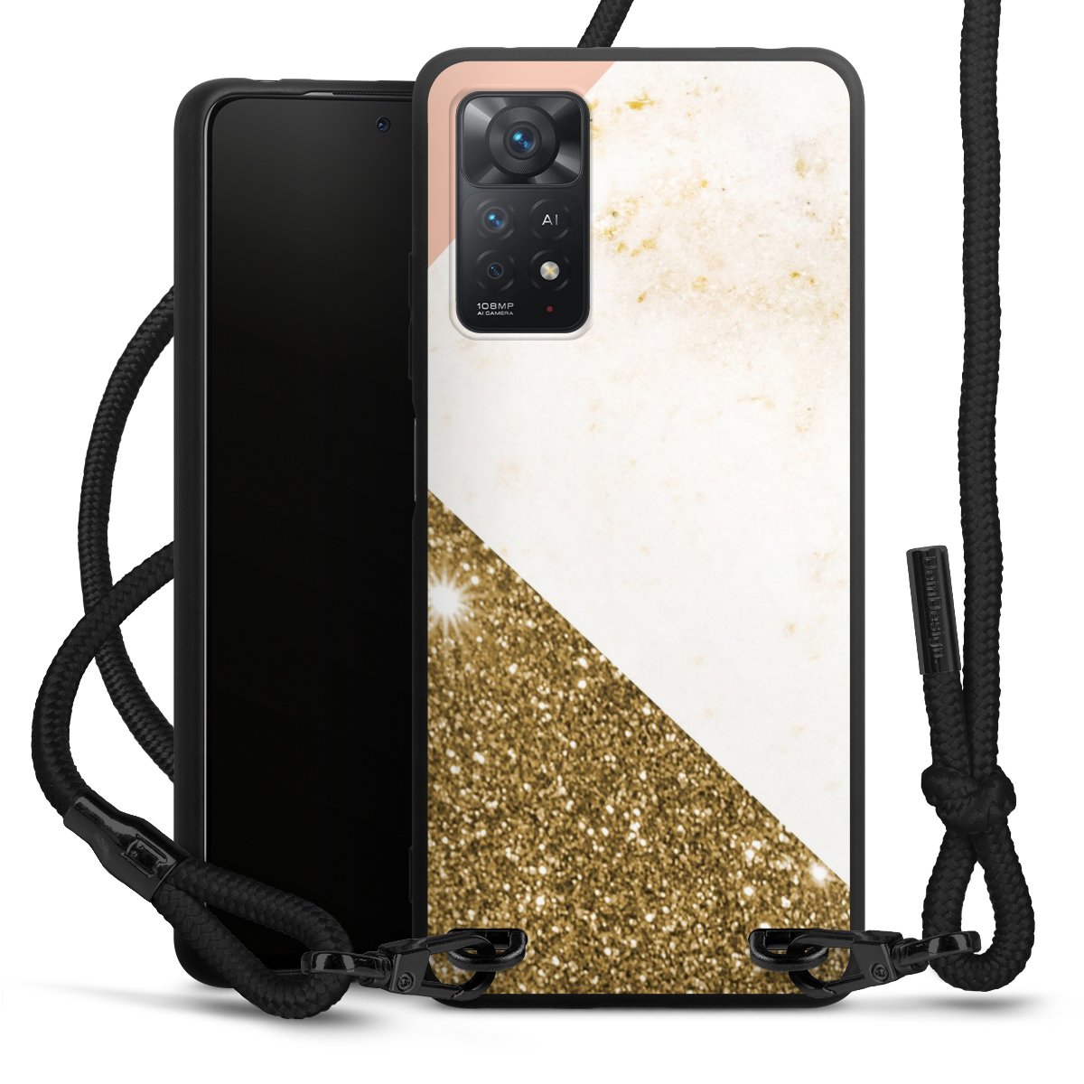 Pure Black: Handyhülle, Stoffband und Metalldetails in stylischem Mattschwarz.