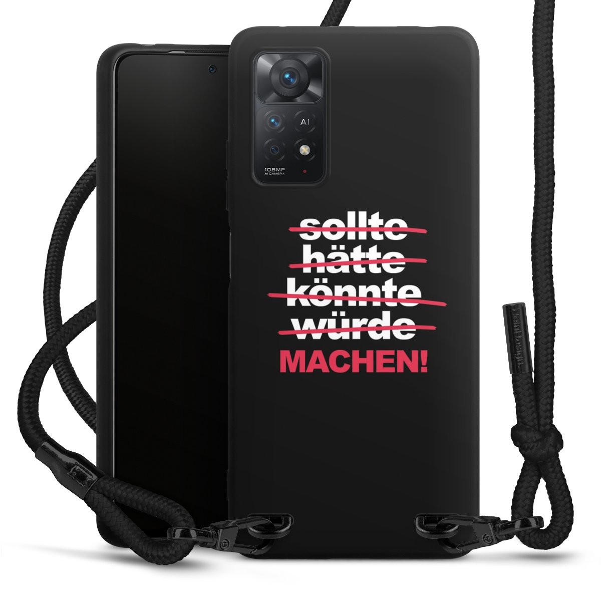 Pure Black: Handyhülle, Stoffband und Metalldetails in stylischem Mattschwarz.