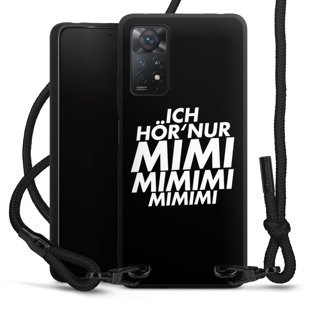Pure Black: Handyhülle, Stoffband und Metalldetails in stylischem Mattschwarz.