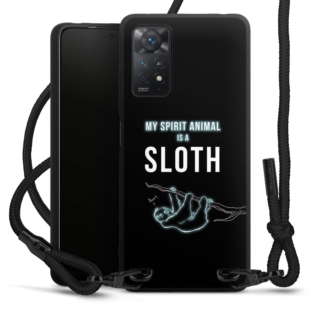 Pure Black: Handyhülle, Stoffband und Metalldetails in stylischem Mattschwarz.
