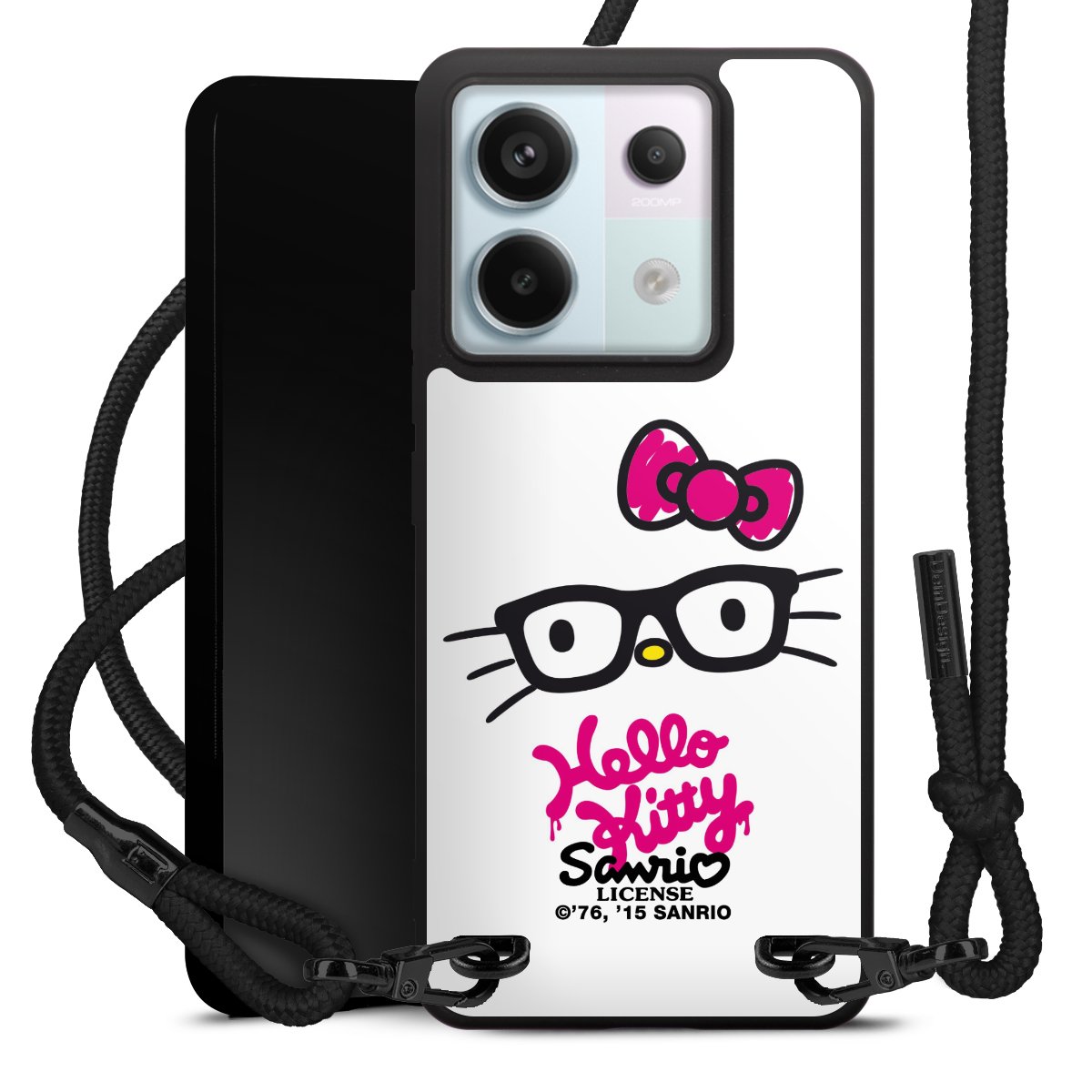 Pure Black: Handyhülle, Stoffband und Metalldetails in stylischem Mattschwarz.