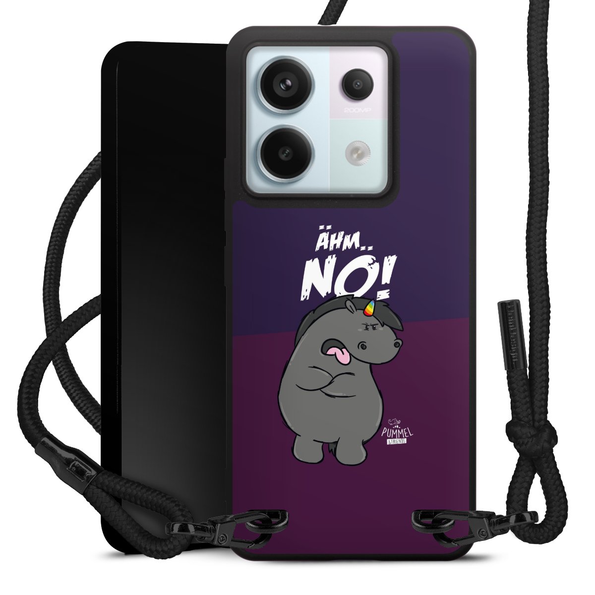 Pure Black: Handyhülle, Stoffband und Metalldetails in stylischem Mattschwarz.