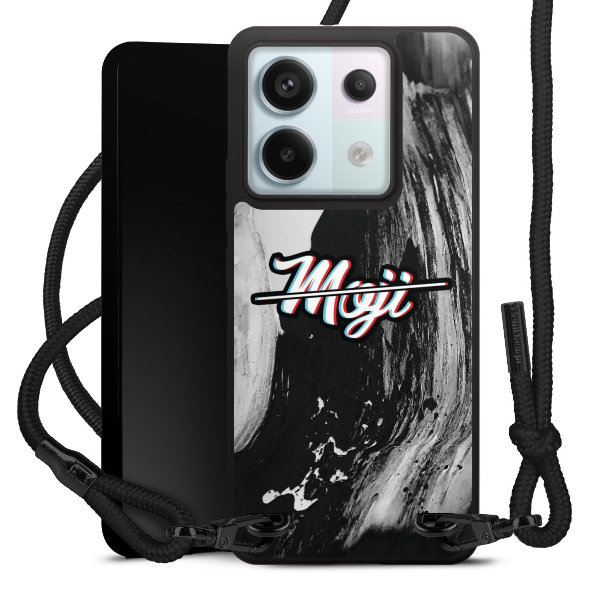 Pure Black: Handyhülle, Stoffband und Metalldetails in stylischem Mattschwarz.
