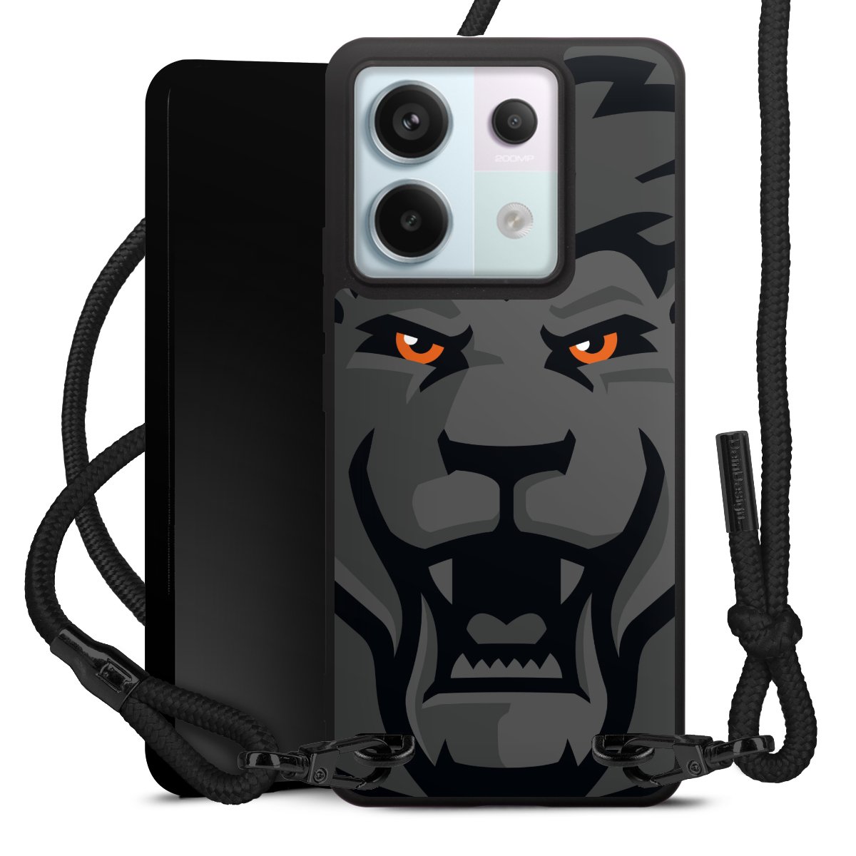 Pure Black: Handyhülle, Stoffband und Metalldetails in stylischem Mattschwarz.