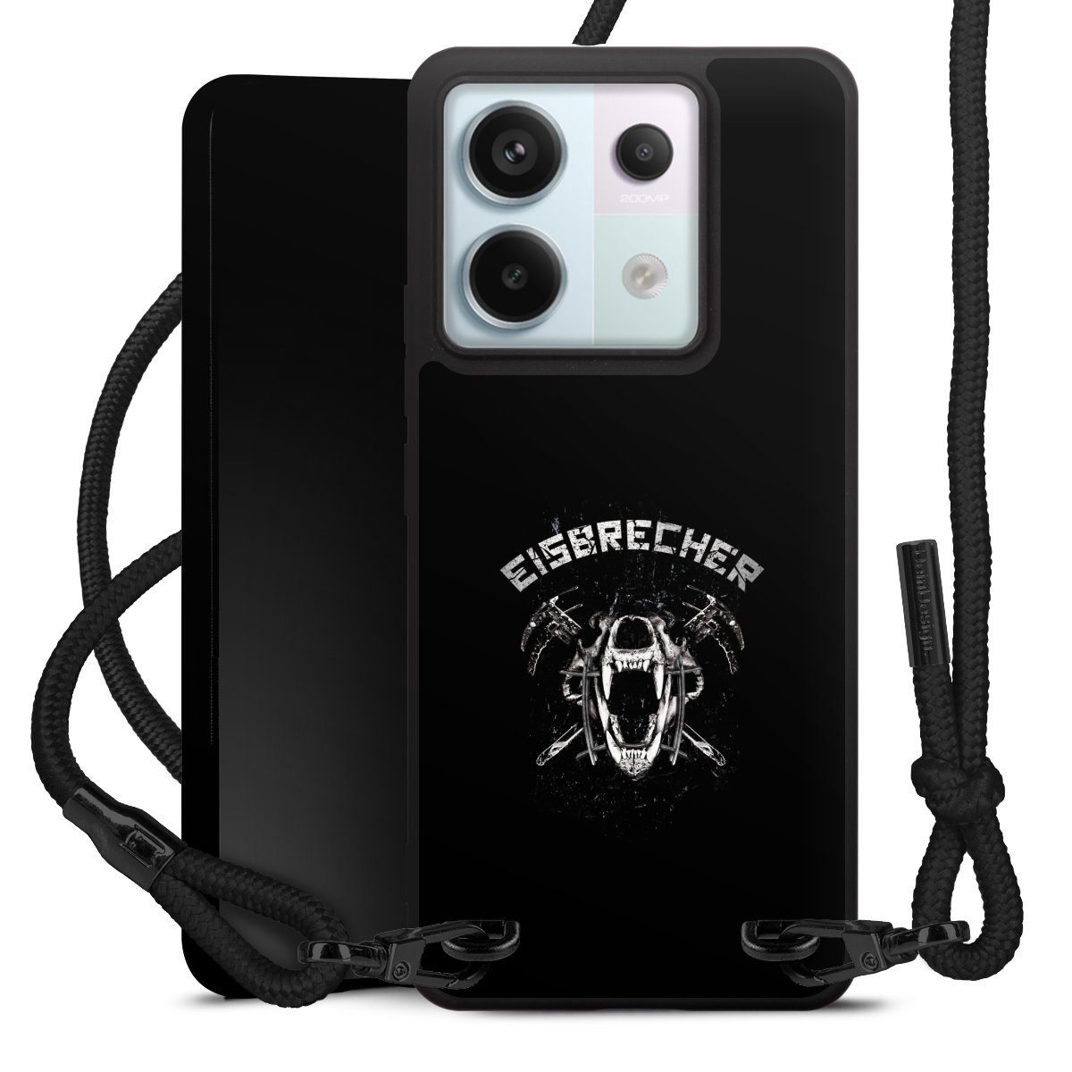 Pure Black: Handyhülle, Stoffband und Metalldetails in stylischem Mattschwarz.