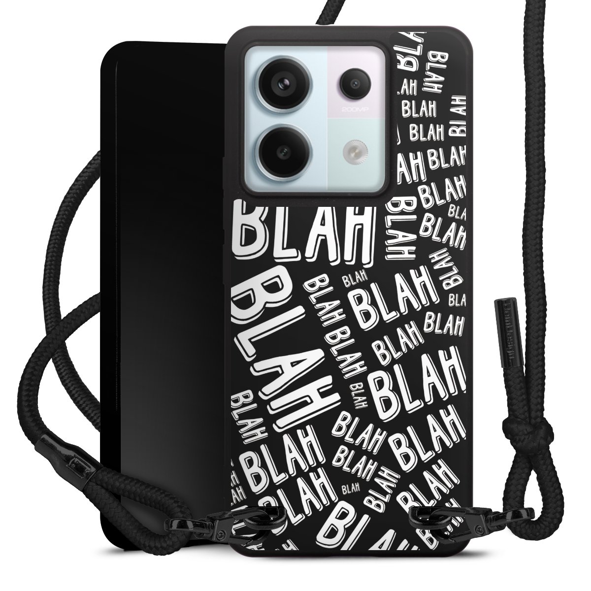 Pure Black: Handyhülle, Stoffband und Metalldetails in stylischem Mattschwarz.