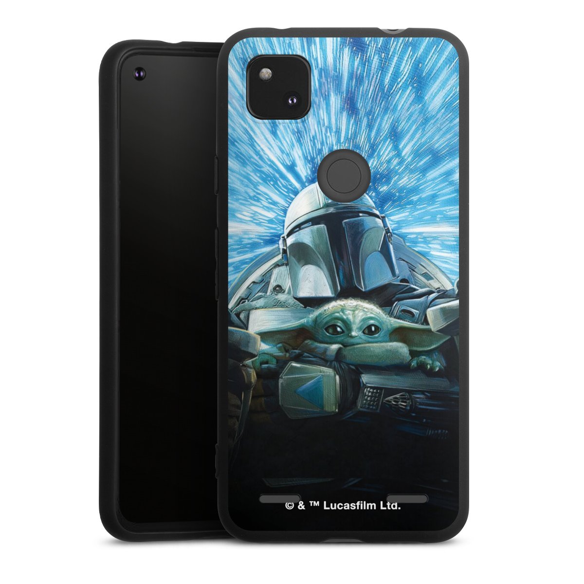 Grogu und Mando fliegen blau