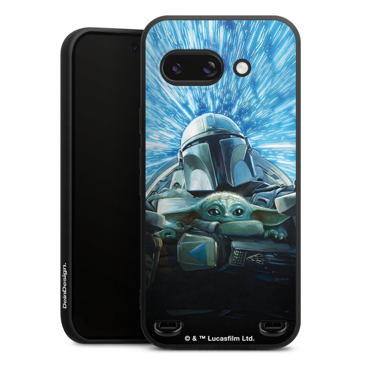 Grogu und Mando fliegen blau