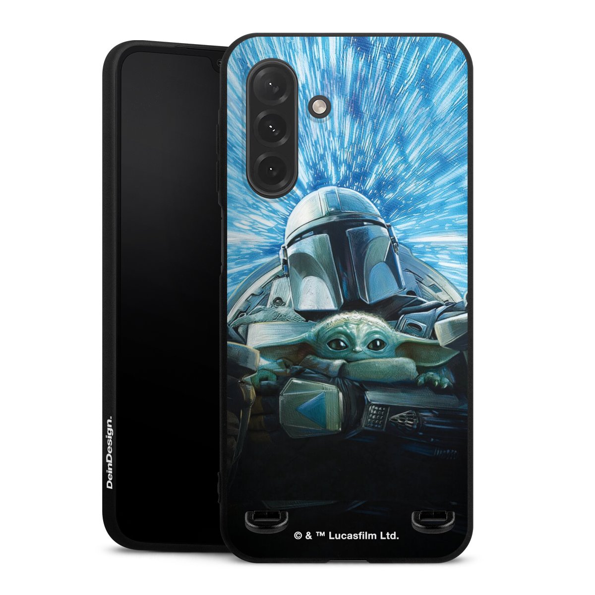 Grogu und Mando fliegen blau