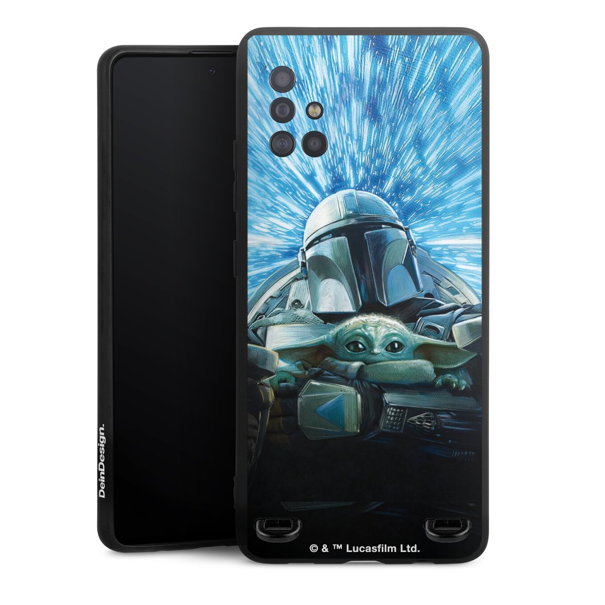 Grogu und Mando fliegen blau