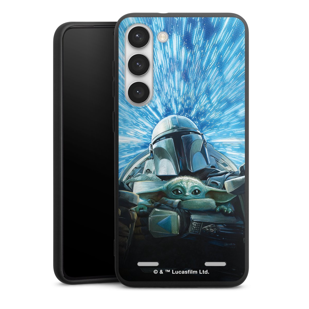 Grogu und Mando fliegen blau