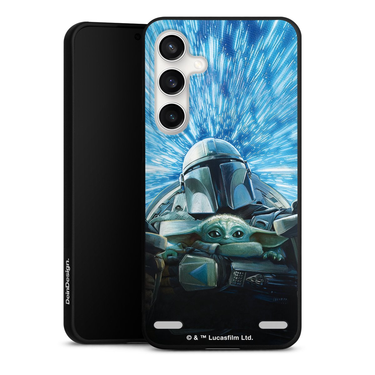 Grogu und Mando fliegen blau