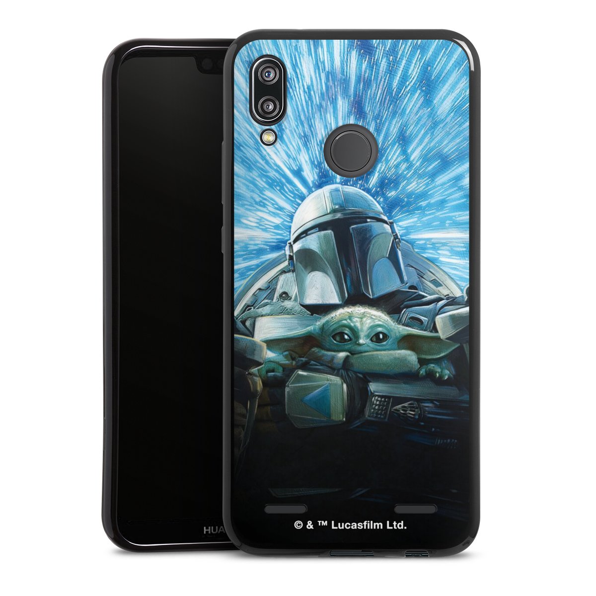 Grogu und Mando fliegen blau