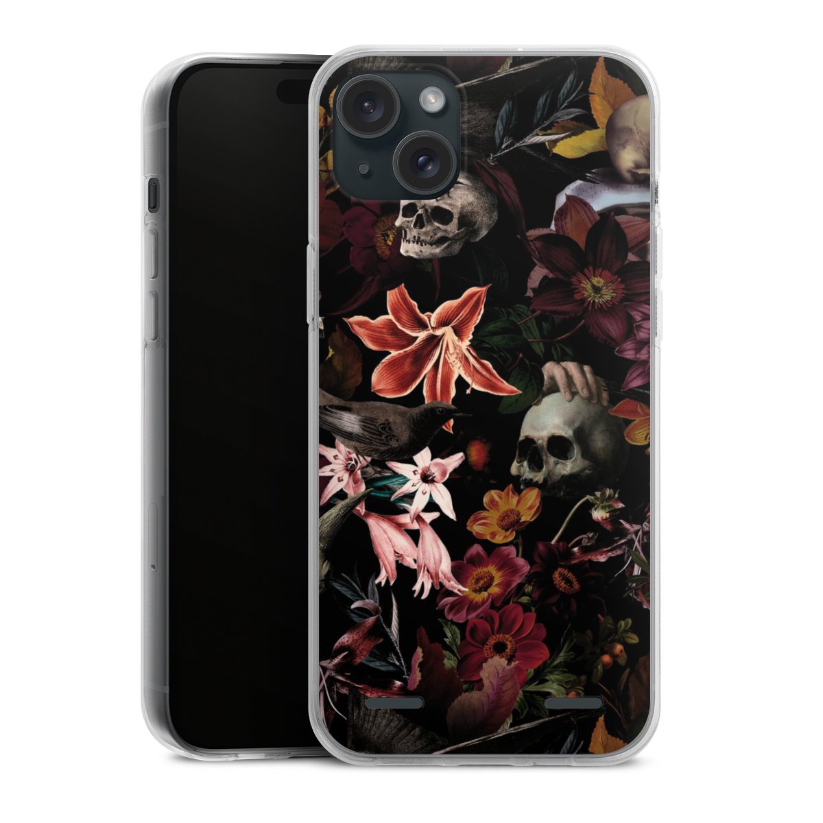 Totenköpfe und Blumen auf dunklem Hintergrund