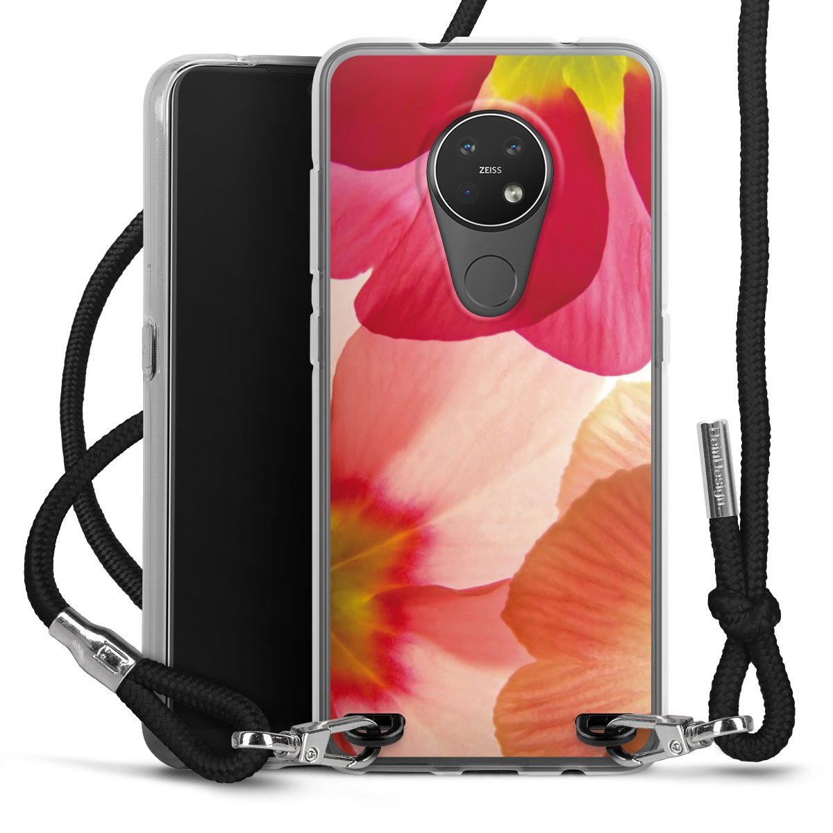 Die transparente Silikonhülle besteht aus flexiblen TPU (thermoplastisches Polyurethan) und bietet zugleich robusten Schutz. Durch das langlebige, bruchsichere Material ist die Hülle biegsam und formbeständig zugleich. Das stylische Trend-Accessoire liegt griffig in der Hand und wird optimal von der Handykette aus Stoff (Polyester) ergänzt. Das geflochtene Stoffband ist ca. 1,70 Meter lang mit einem Durchmesser von ca. 0,5cm. Aufgrund der besonderen Knotentechnik ist das Band durch einfaches Ziehen in der Länge verstellbar, damit Du es individuell nach Deinen Wünschen anpassen kannst. Das praktische Case zum Umhängen ist mit dem Stoffband in den Farben Schwarz, Rot, Rosa, Grau, Senfgelb, Bordeaux und Royalblau erhältlich. Die Enden des Stoffbandes sind mit metallischen Endkappen umfasst und somit sicher vor dem Ausfransen geschützt.