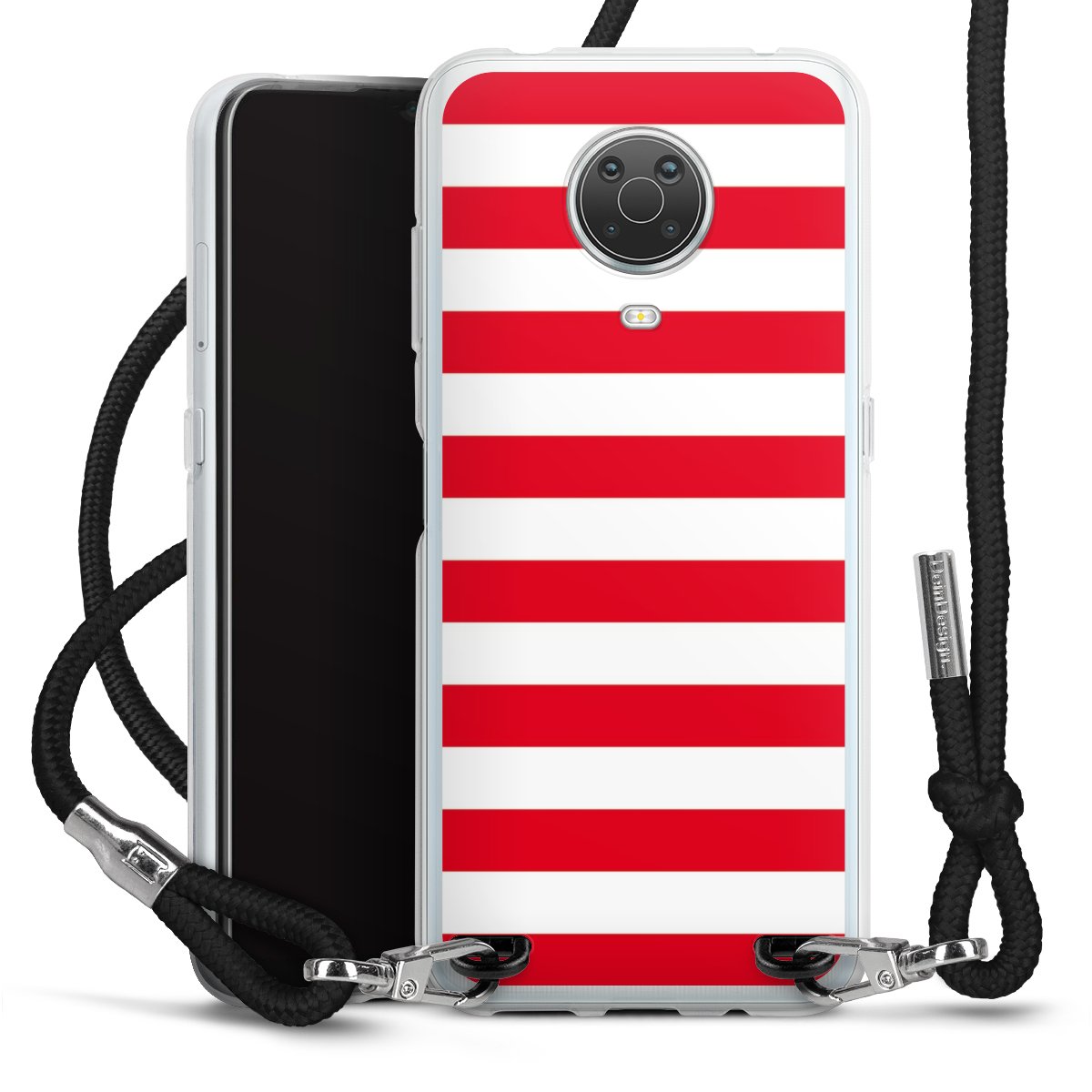 Die transparente Silikonhülle besteht aus flexiblen TPU (thermoplastisches Polyurethan) und bietet zugleich robusten Schutz. Durch das langlebige, bruchsichere Material ist die Hülle biegsam und formbeständig zugleich. Das stylische Trend-Accessoire liegt griffig in der Hand und wird optimal von der Handykette aus Stoff (Polyester) ergänzt. Das geflochtene Stoffband ist ca. 1,70 Meter lang mit einem Durchmesser von ca. 0,5cm. Aufgrund der besonderen Knotentechnik ist das Band durch einfaches Ziehen in der Länge verstellbar, damit Du es individuell nach Deinen Wünschen anpassen kannst. Das praktische Case zum Umhängen ist mit dem Stoffband in den Farben Schwarz, Rot, Rosa, Grau, Senfgelb, Bordeaux und Royalblau erhältlich. Die Enden des Stoffbandes sind mit metallischen Endkappen umfasst und somit sicher vor dem Ausfransen geschützt.