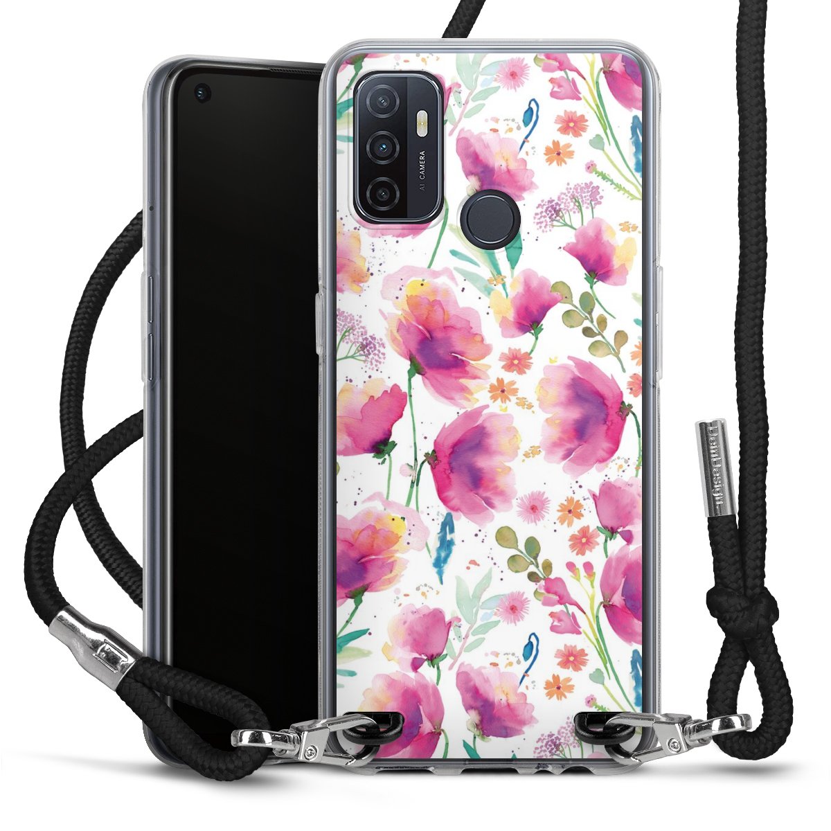 Habe Dein Handy, dank der flexiblen Silikon Handyhülle zum Umhängen mit der Handykette aus Stoff, immer griffbereit.