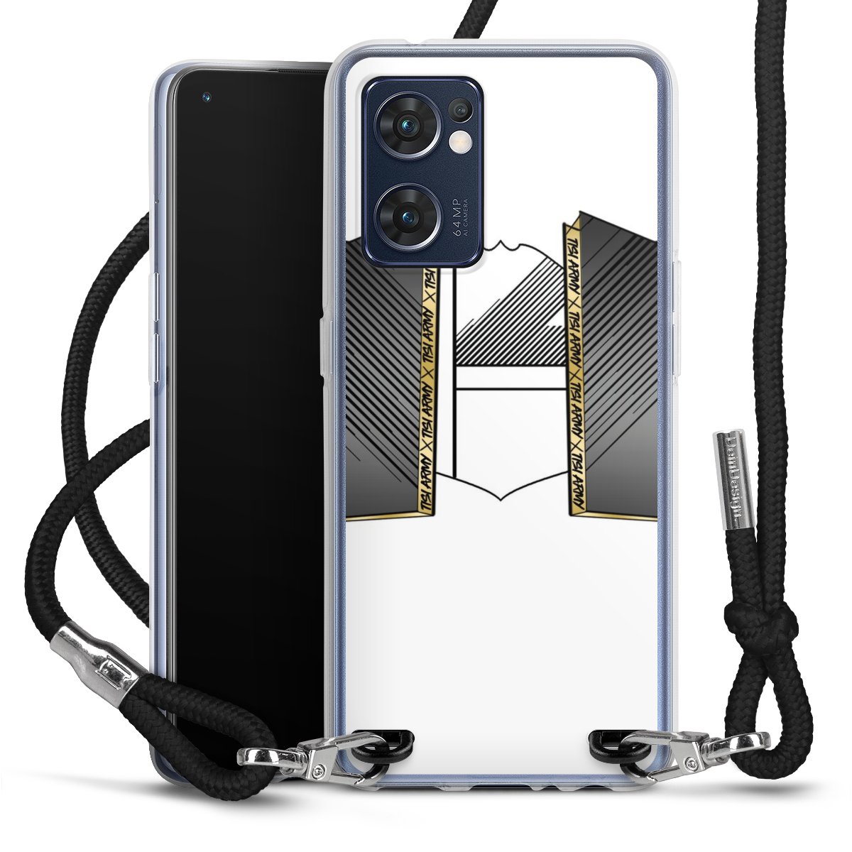 Die transparente Silikonhülle besteht aus flexiblen TPU (thermoplastisches Polyurethan) und bietet zugleich robusten Schutz. Durch das langlebige, bruchsichere Material ist die Hülle biegsam und formbeständig zugleich. Das stylische Trend-Accessoire liegt griffig in der Hand und wird optimal von der Handykette aus Stoff (Polyester) ergänzt. Das geflochtene Stoffband ist ca. 1,70 Meter lang mit einem Durchmesser von ca. 0,5cm. Aufgrund der besonderen Knotentechnik ist das Band durch einfaches Ziehen in der Länge verstellbar, damit Du es individuell nach Deinen Wünschen anpassen kannst. Das praktische Case zum Umhängen ist mit dem Stoffband in den Farben Schwarz, Rot, Rosa, Grau, Senfgelb, Bordeaux und Royalblau erhältlich. Die Enden des Stoffbandes sind mit metallischen Endkappen umfasst und somit sicher vor dem Ausfransen geschützt.