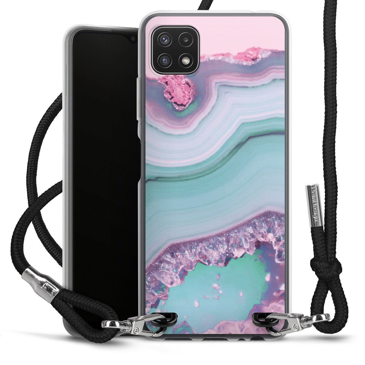 Bei dieser Handyhülle nutzen wir das solide Direktdruck-Verfahren, weshalb der Druckbereich ausschließlich die Rückseite umfasst und der Rand hingegen unbedruckt bleibt. Das Case zum Umhängen kann sowohl unbedruckt, als auch vollflächig oder partiell bedruckt bestellt werden. Wähle für Dein Design entweder eines unserer exklusiven Shop-Motive, oder werde kreativ und gestalte Dein Wunschdesign zum Beispiel mit Fotos und Overlays selbst. Designe Dir Dein persönliches Trend-Accessoire und setze ein individuelles Statement auf den Straßen!