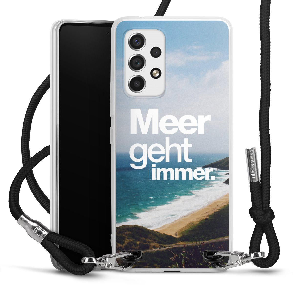 Bei dieser Handyhülle nutzen wir das solide Direktdruck-Verfahren, weshalb der Druckbereich ausschließlich die Rückseite umfasst und der Rand hingegen unbedruckt bleibt. Das Case zum Umhängen kann sowohl unbedruckt, als auch vollflächig oder partiell bedruckt bestellt werden. Wähle für Dein Design entweder eines unserer exklusiven Shop-Motive, oder werde kreativ und gestalte Dein Wunschdesign zum Beispiel mit Fotos und Overlays selbst. Designe Dir Dein persönliches Trend-Accessoire und setze ein individuelles Statement auf den Straßen!