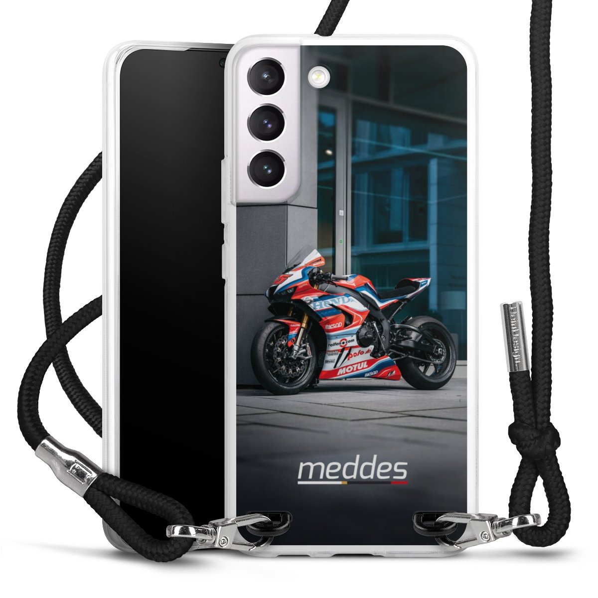 Bei dieser Handyhülle nutzen wir das solide Direktdruck-Verfahren, weshalb der Druckbereich ausschließlich die Rückseite umfasst und der Rand hingegen unbedruckt bleibt. Das Case zum Umhängen kann sowohl unbedruckt, als auch vollflächig oder partiell bedruckt bestellt werden. Wähle für Dein Design entweder eines unserer exklusiven Shop-Motive, oder werde kreativ und gestalte Dein Wunschdesign zum Beispiel mit Fotos und Overlays selbst. Designe Dir Dein persönliches Trend-Accessoire und setze ein individuelles Statement auf den Straßen!