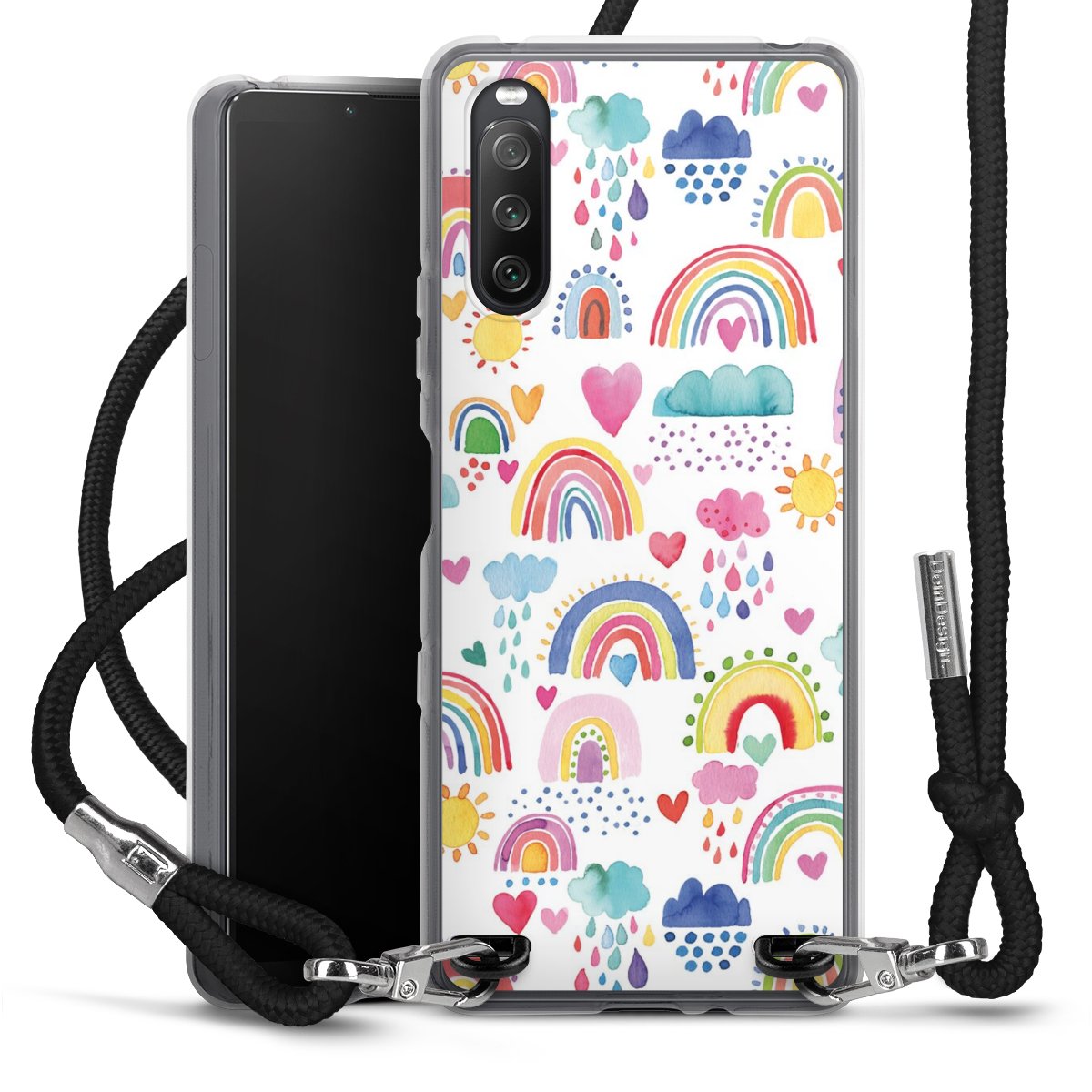 Habe Dein Handy, dank der flexiblen Silikon Handyhülle zum Umhängen mit der Handykette aus Stoff, immer griffbereit.