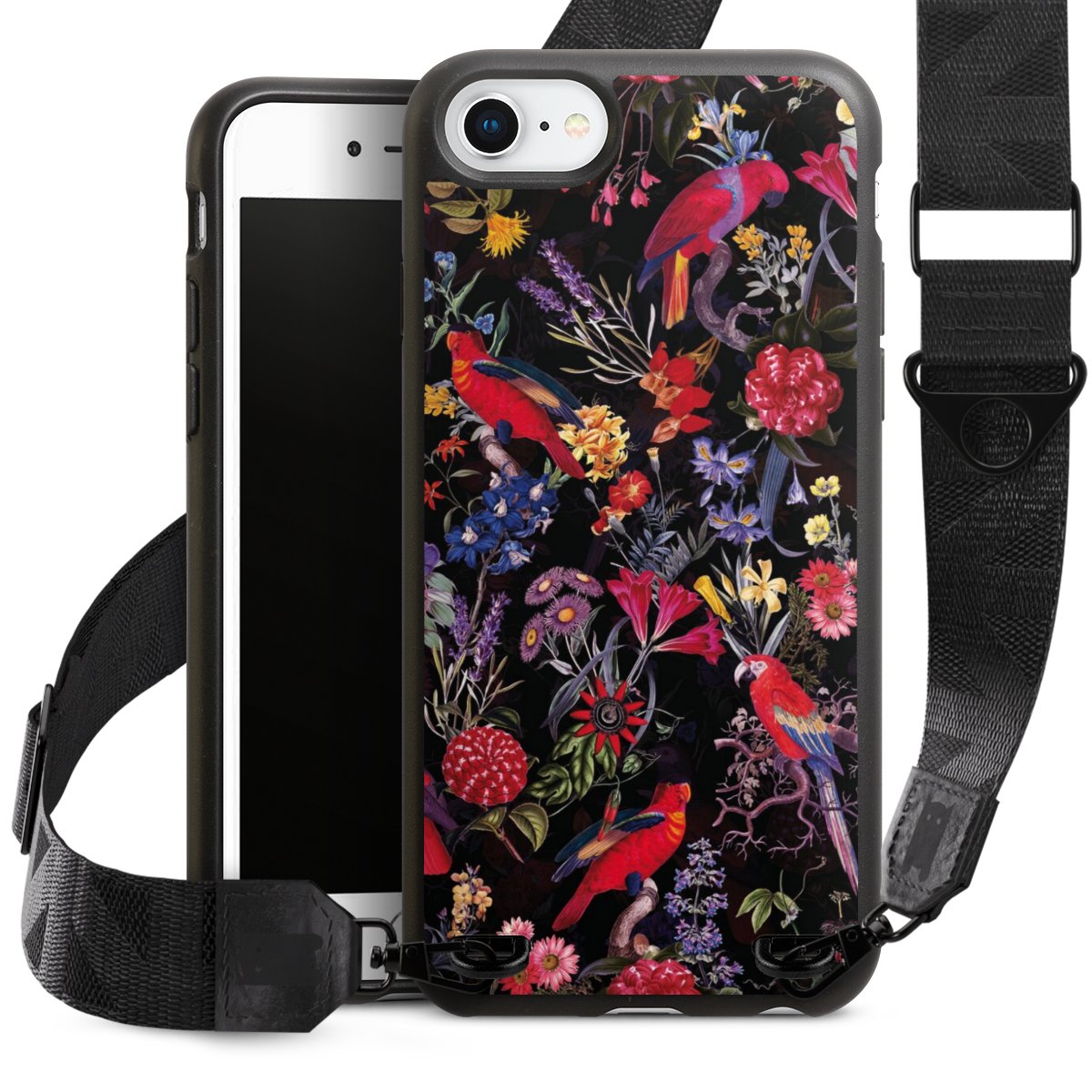 Dunkle Blumen und Papageien