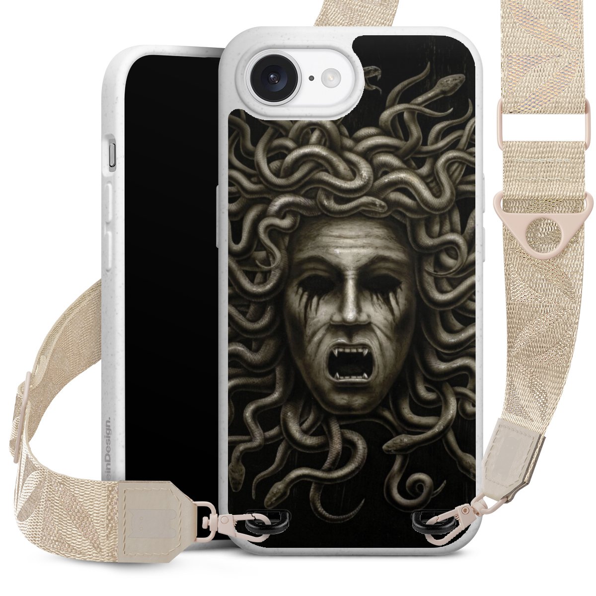 Gestalte Dein Case ganz nach Deinen Wünschen! Edles Creme oder lieber klassisches Schwarz? Du entscheidest, welche Farbe am besten zu Dir passt. Die dezenten Designs der Gurtbänder passen garantiert zu Deiner Hülle, egal mit welchem Lieblingsmotiv Du Dein Case bedrucken lässt.