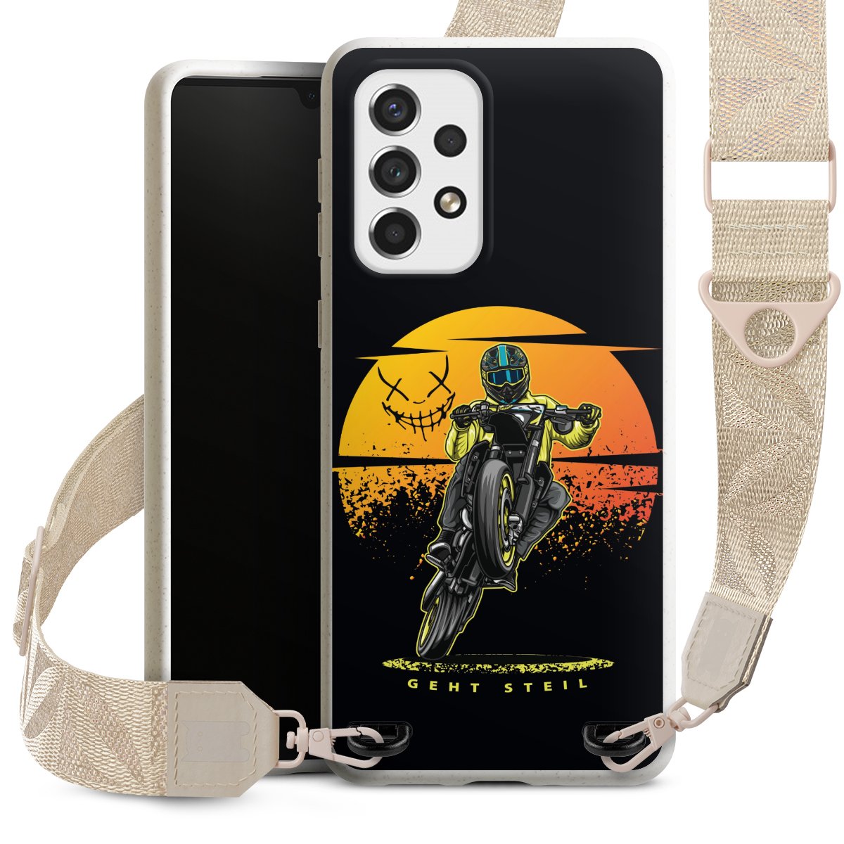 Gestalte Dein Case ganz nach Deinen Wünschen! Edles Creme oder lieber klassisches Schwarz? Du entscheidest, welche Farbe am besten zu Dir passt. Die dezenten Designs der Gurtbänder passen garantiert zu Deiner Hülle, egal mit welchem Lieblingsmotiv Du Dein Case bedrucken lässt.