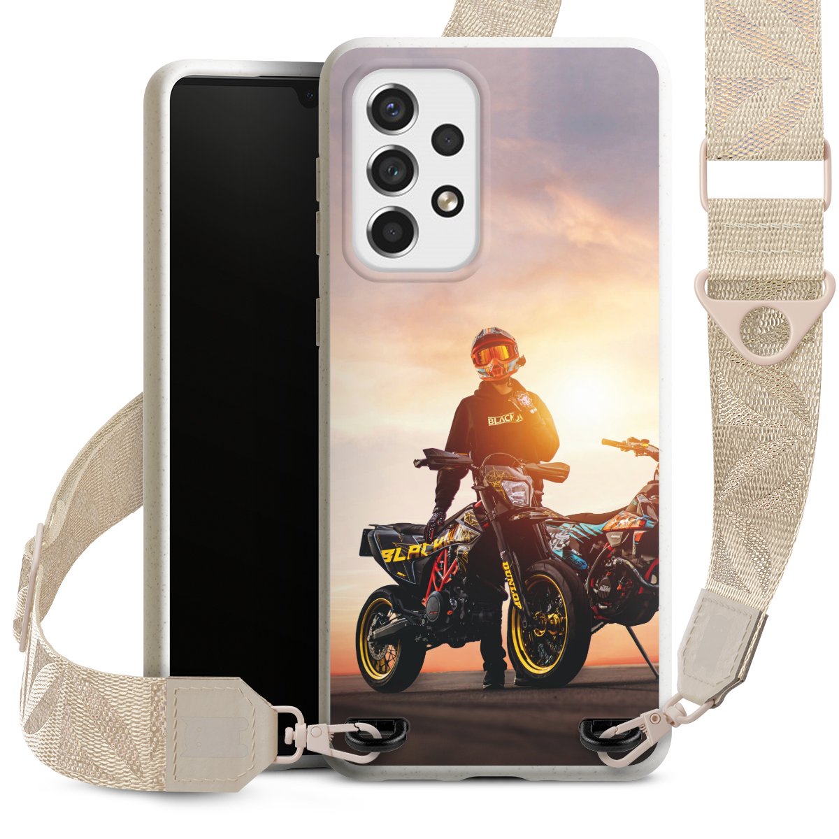 Gestalte Dein Case ganz nach Deinen Wünschen! Edles Creme oder lieber klassisches Schwarz? Du entscheidest, welche Farbe am besten zu Dir passt. Die dezenten Designs der Gurtbänder passen garantiert zu Deiner Hülle, egal mit welchem Lieblingsmotiv Du Dein Case bedrucken lässt.