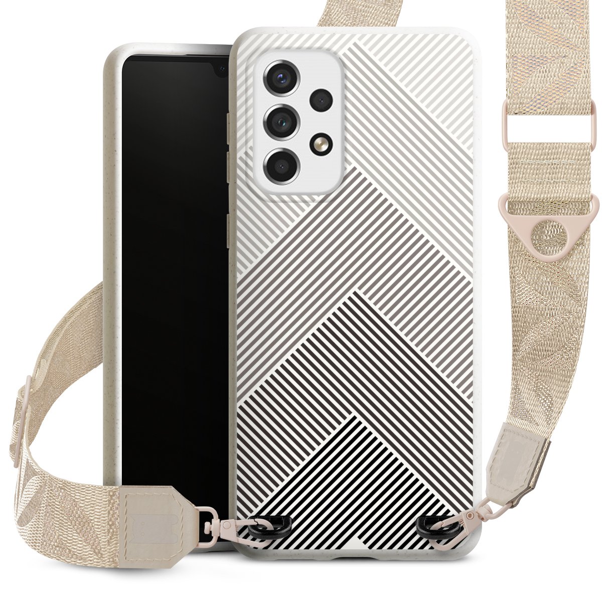 Gestalte Dein Case ganz nach Deinen Wünschen! Edles Creme oder lieber klassisches Schwarz? Du entscheidest, welche Farbe am besten zu Dir passt. Die dezenten Designs der Gurtbänder passen garantiert zu Deiner Hülle, egal mit welchem Lieblingsmotiv Du Dein Case bedrucken lässt.