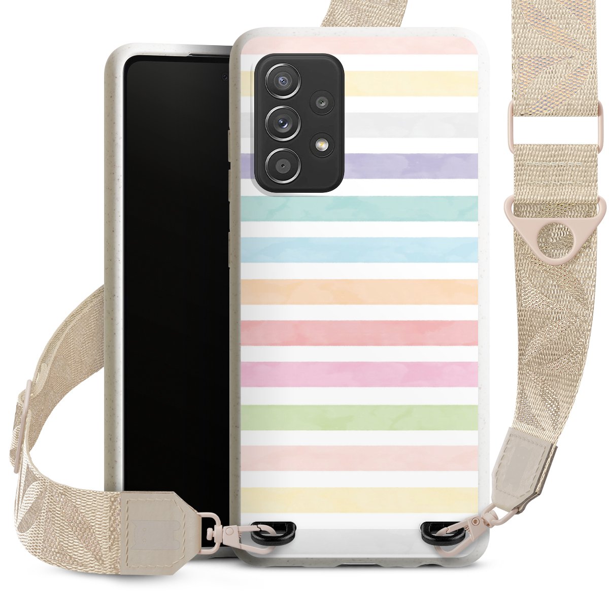 Gestalte Dein Case ganz nach Deinen Wünschen! Edles Creme oder lieber klassisches Schwarz? Du entscheidest, welche Farbe am besten zu Dir passt. Die dezenten Designs der Gurtbänder passen garantiert zu Deiner Hülle, egal mit welchem Lieblingsmotiv Du Dein Case bedrucken lässt.