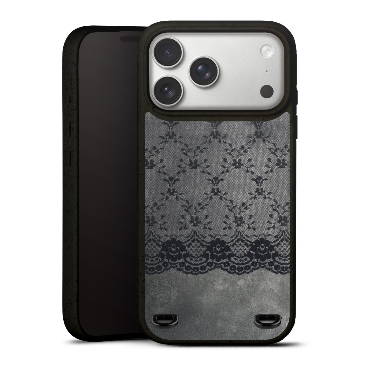 Schwarzes Spitzenmuster auf grauem Hintergrund