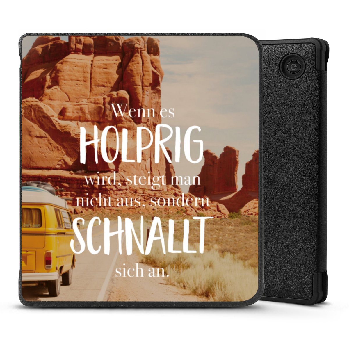 Die praktische Hülle schützt Deinen E-Reader auf der Vorder- und Rückseite durch hochwertiges und veganes Skai®-Kunstleder. Innen befindet sich eine robuste Polycarbonat Schale, zusätzlich ist die Innenseite der Hülle mit weicher Mikrofaser gefüttert, um Dein Gerät noch besser zu schützen. Durch das flexible Flip Cover ist der Bildschirm Deines E-Reader sicher vor Kratzern und Stößen. Die Hülle ist in der Farbe Schwarz erhältlich.